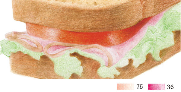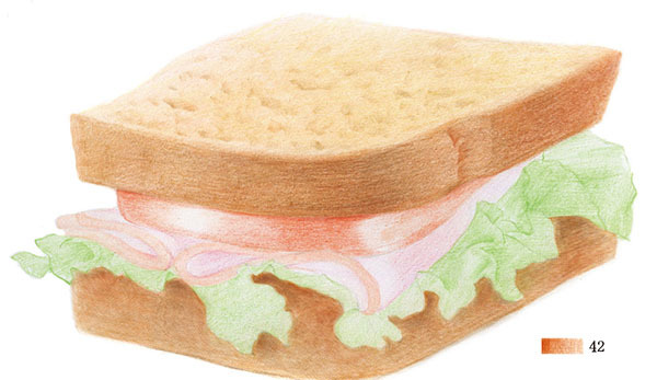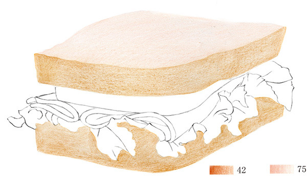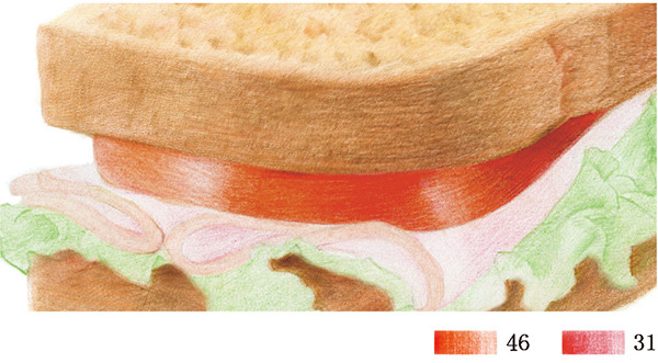 STEP4:用45号红赭色画出上层面包侧面的暗部及褶皱部分。由于菜叶会在下层面包侧面形成投影,所以下层面包要沿着菜叶边缘整体加深。