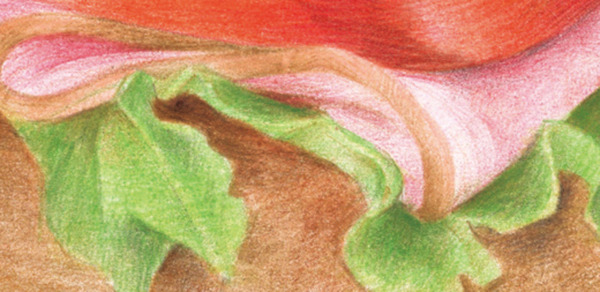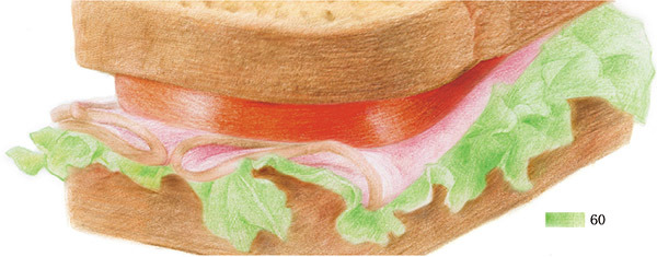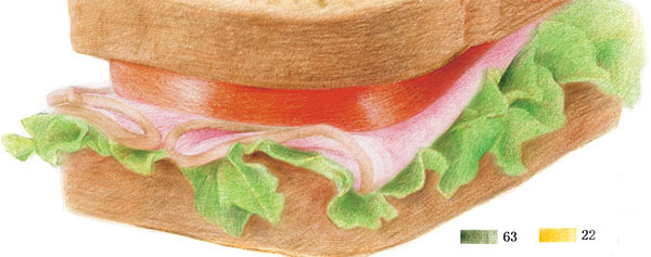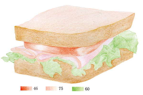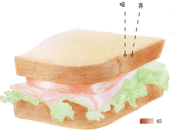光线来自三明治的左侧,因此暗部与影子位于右侧,注意上层食物会在下层食物留下淡淡的投影。