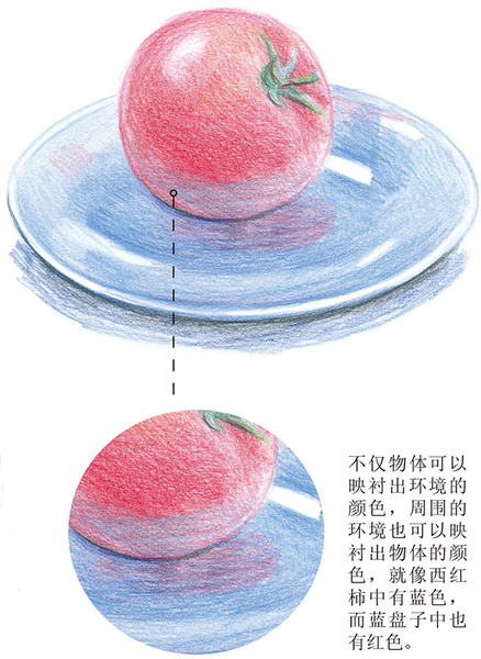 桔子的固有色是桔红色,当它被放在白色衬布上时,下面会“变白”出现一块亮色区域,我们通常把它叫做反光。