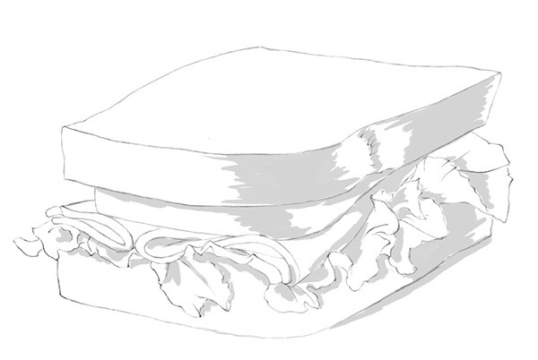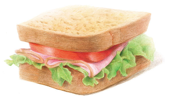 两片面包,夹上西红柿、培根和生菜,几分钟就可以做成一份美味的三明治早餐了!画面包片的时候,下笔要轻一些,注意表现出面包松软的质感。